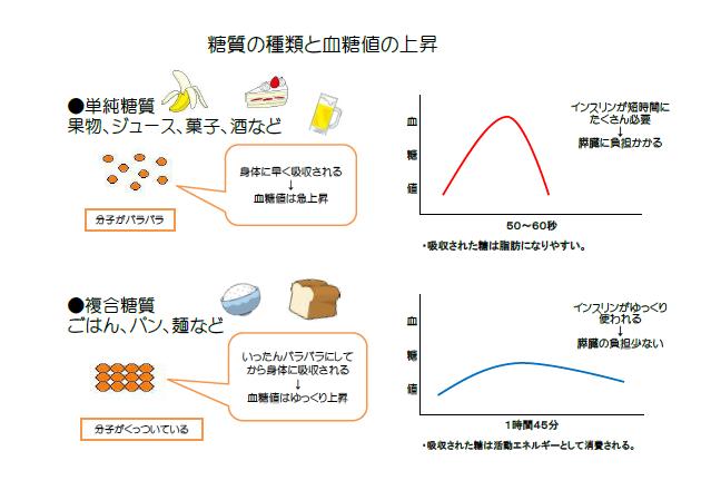 このように、ジュースやお菓子の単純糖質はとっても血糖値上昇が早く短時間にたくさんのインスリンを消費します。そうなると膵臓にものすごい負担となり糖尿病を悪化させます。一方複合糖質はゆるやかに血糖値が上昇するため、インスリンがゆっくり使われ、膵臓の負担は少ないのです。